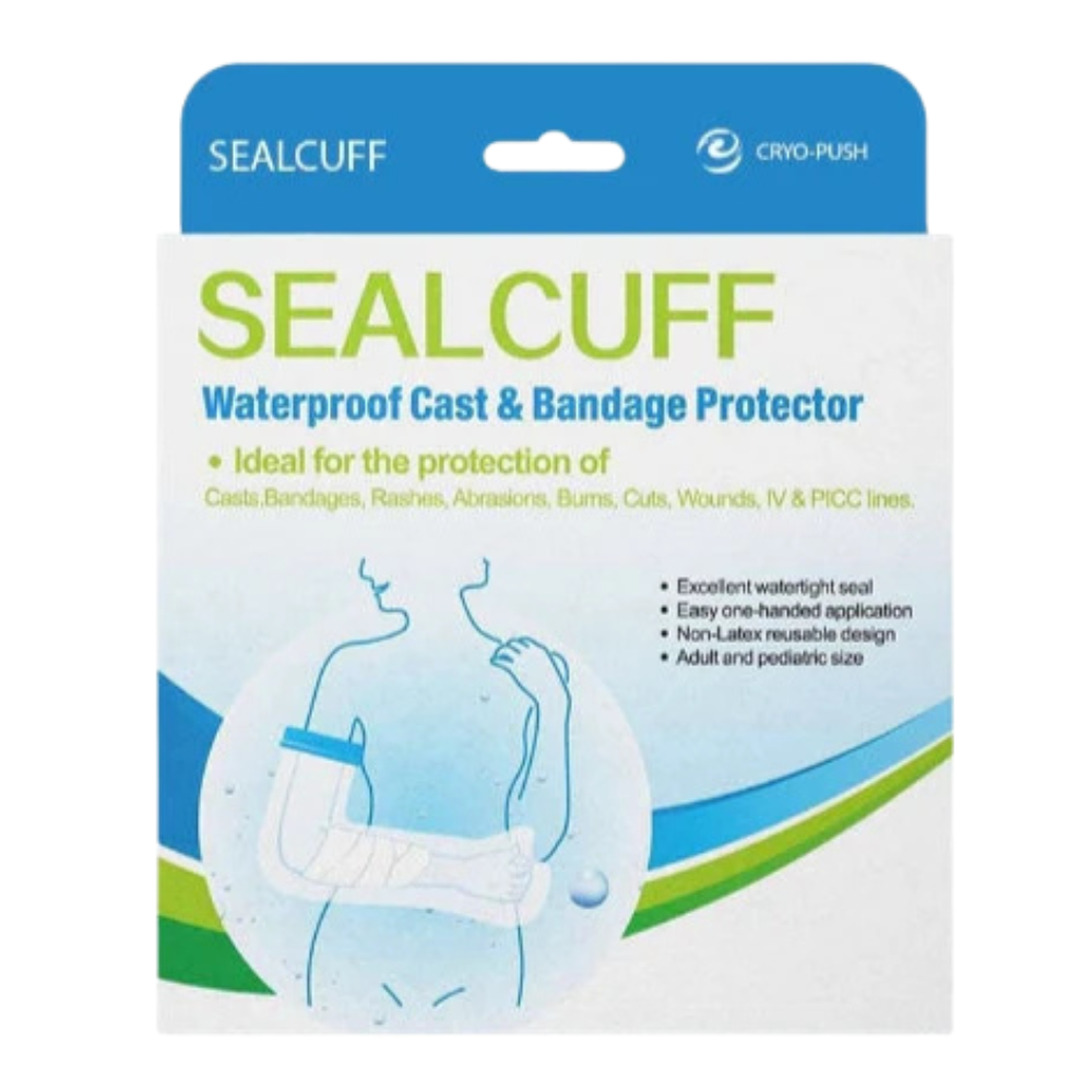 El protector de yeso y vendaje impermeable SEALCUFF garantiza que la lesión se mantenga seca. Está hecho de material suave y cómodo, tiene un sello hermético para una protección confiable y se puede reutilizar varias veces. Disponible en tamaños para adultos y niños para brazos y piernas.